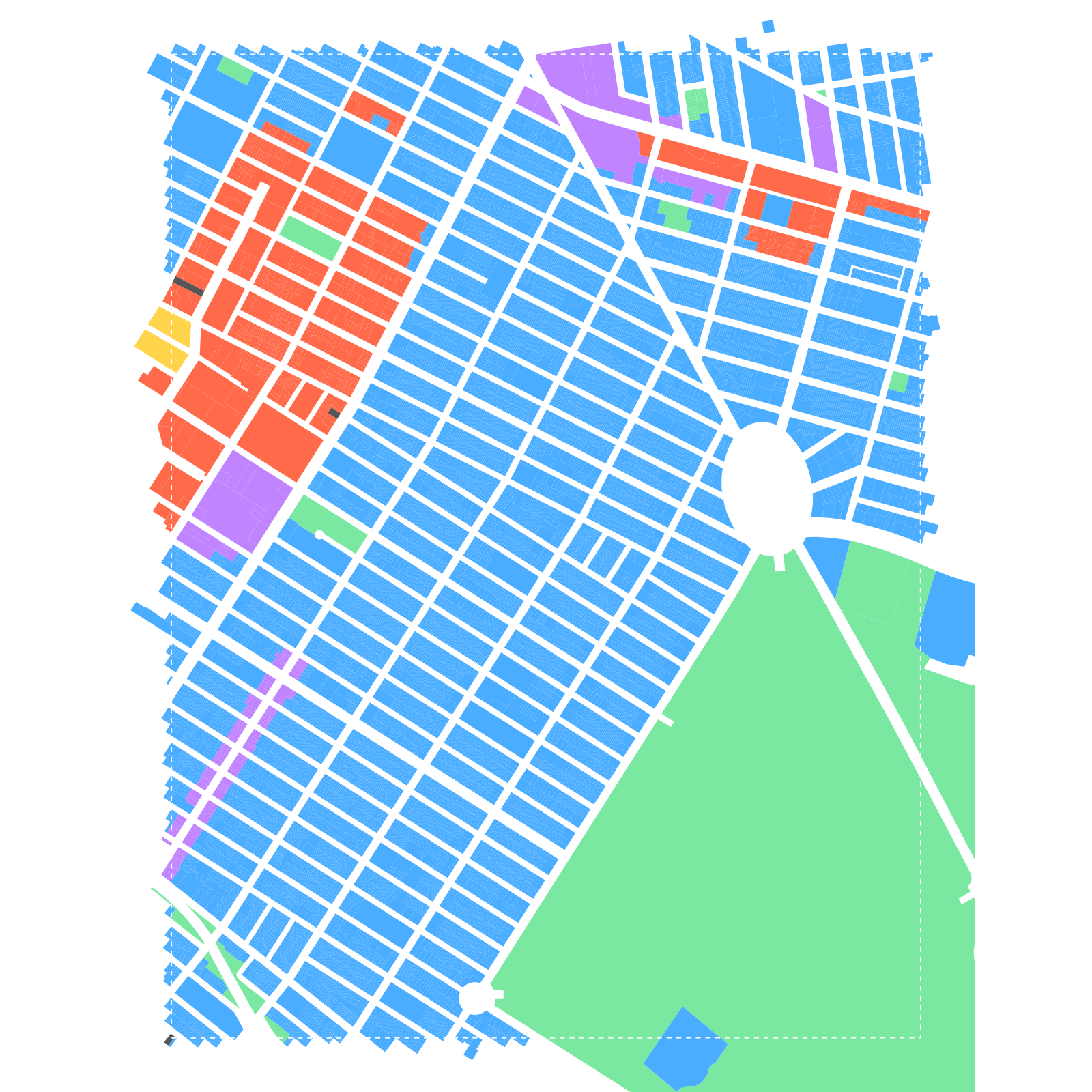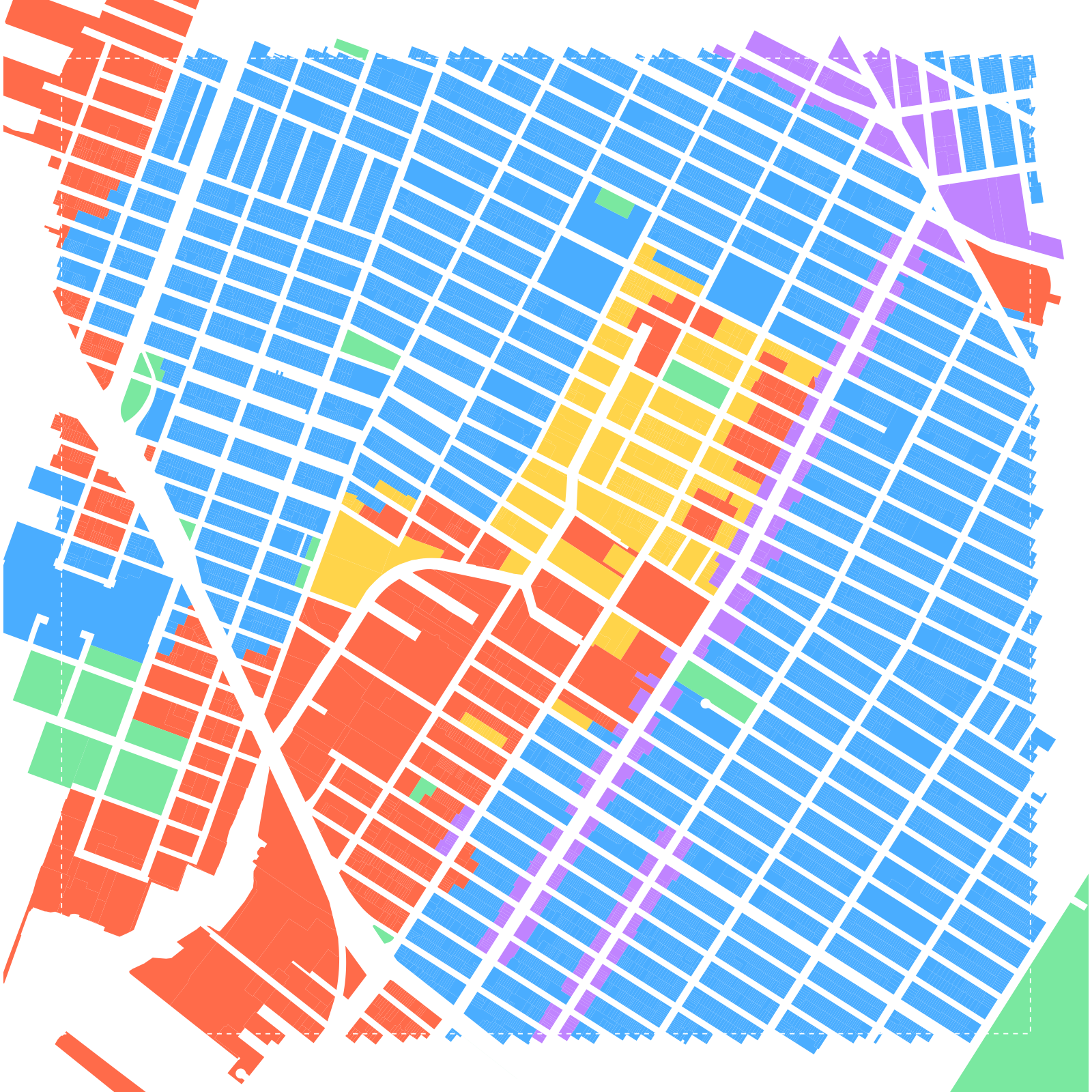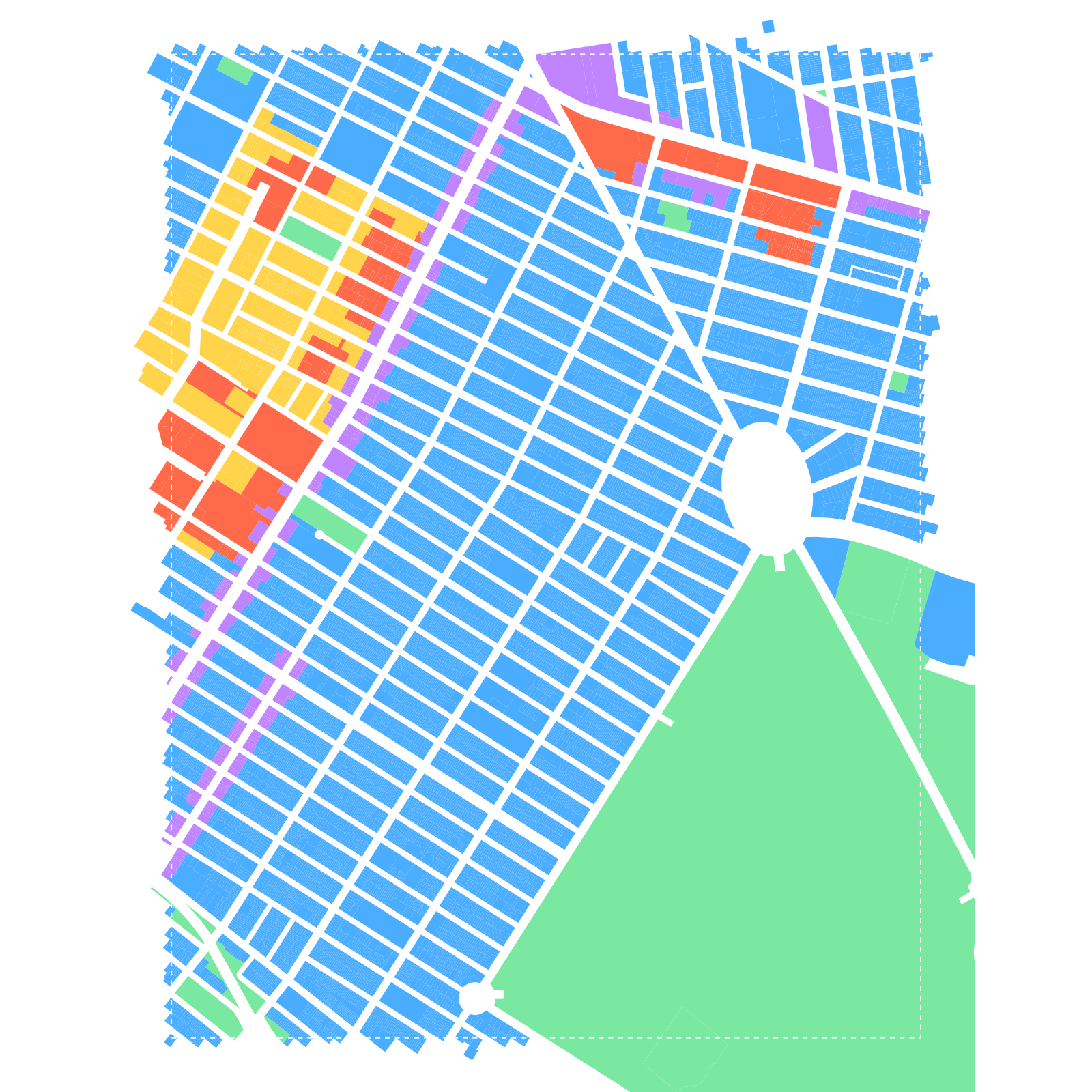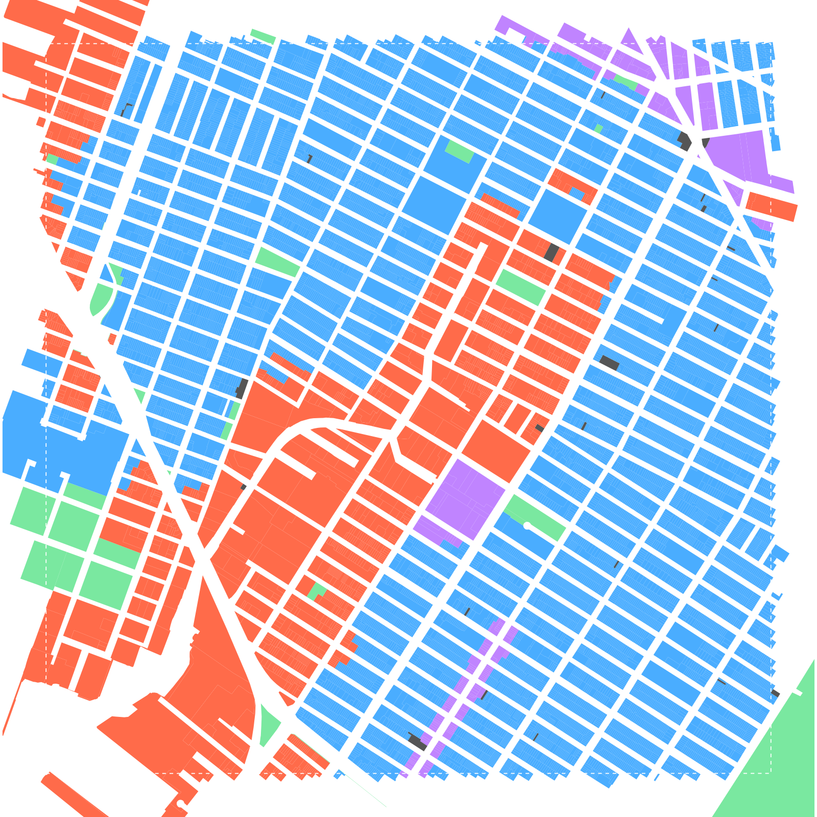 The morphological inheritance is measurable: intersection density, average block perimeter, impervious surface coverage, and tree canopy ratio all retain signatures of their manufacturing-era predecessors, even as the land use classification shifts from M to R on the zoning map.