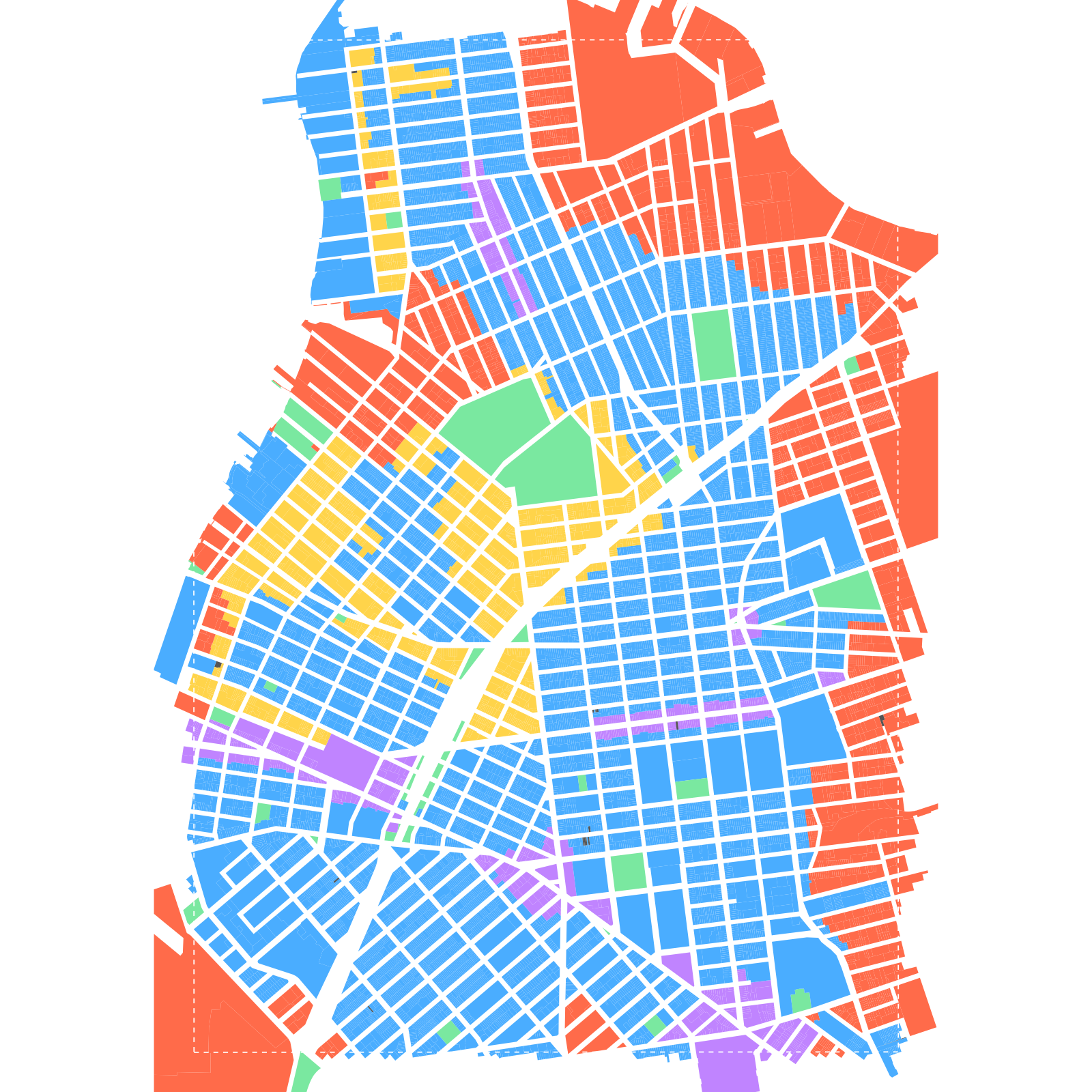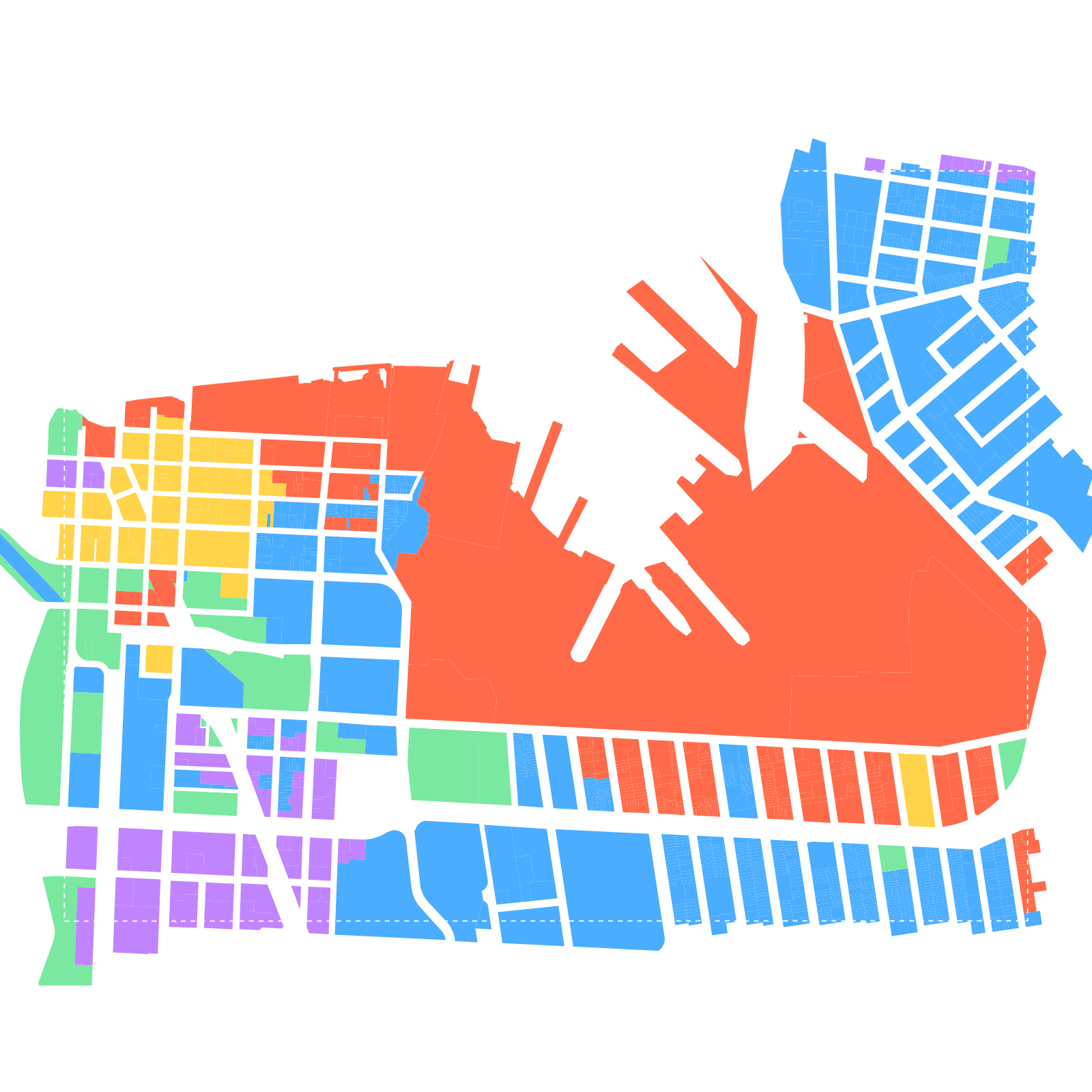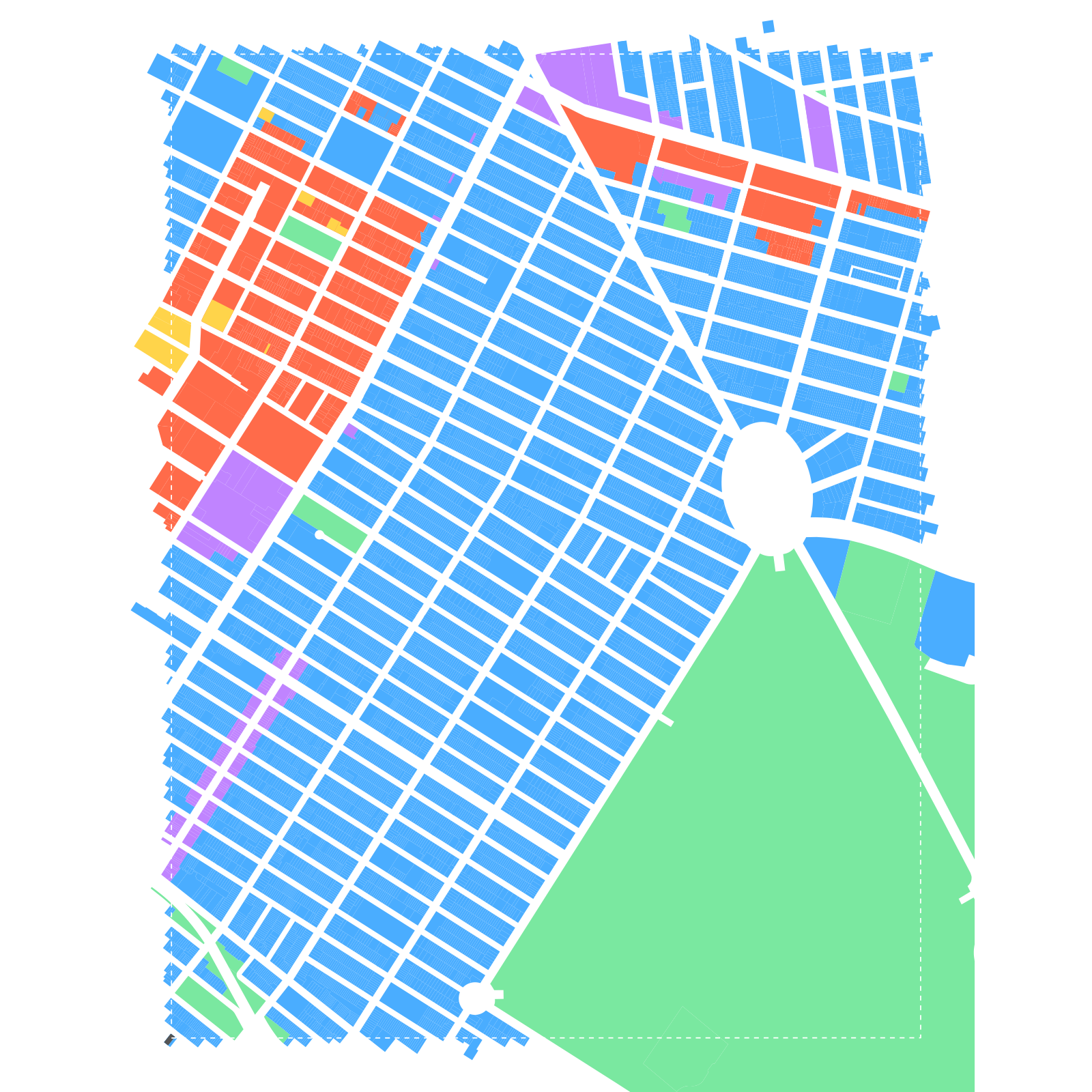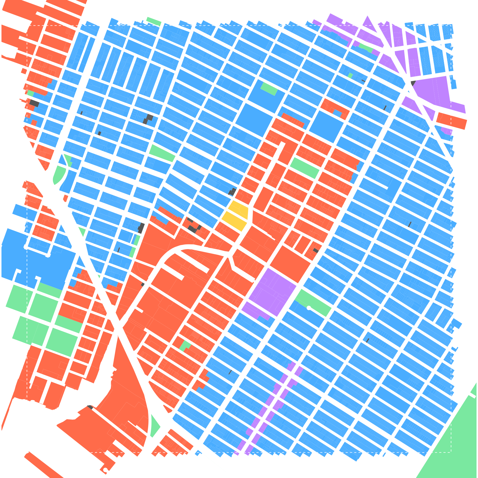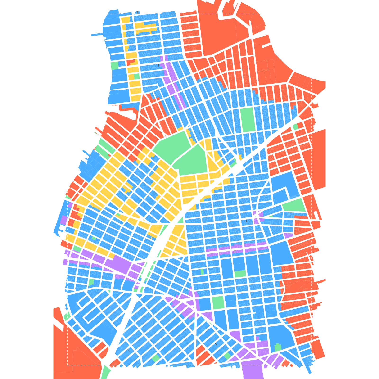 The morphological inheritance is measurable: intersection density, average block perimeter, impervious surface coverage, and tree canopy ratio all retain signatures of their manufacturing-era predecessors, even as the land use classification shifts from M to R on the zoning map.