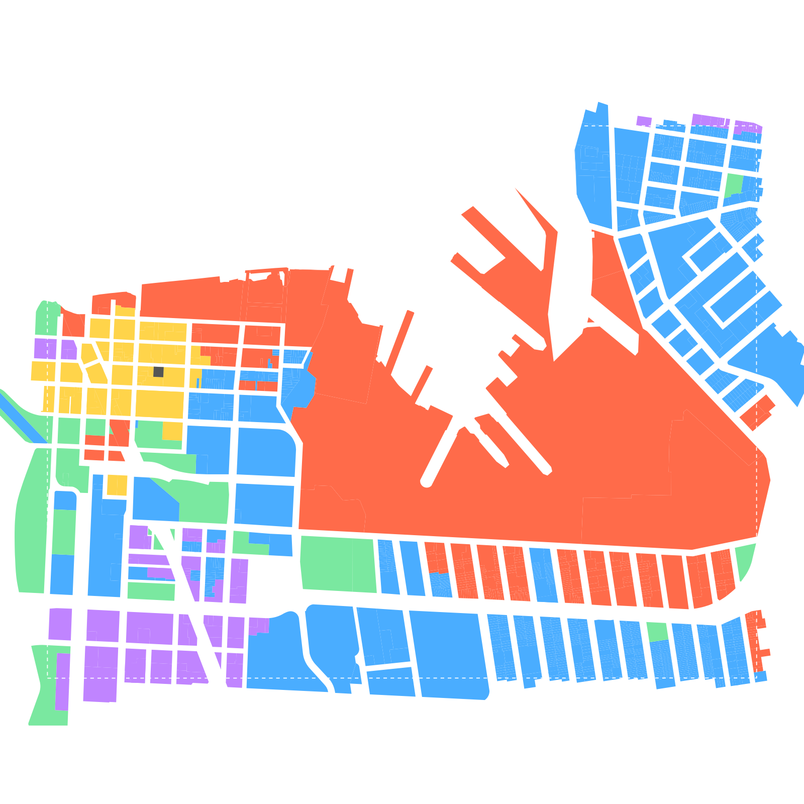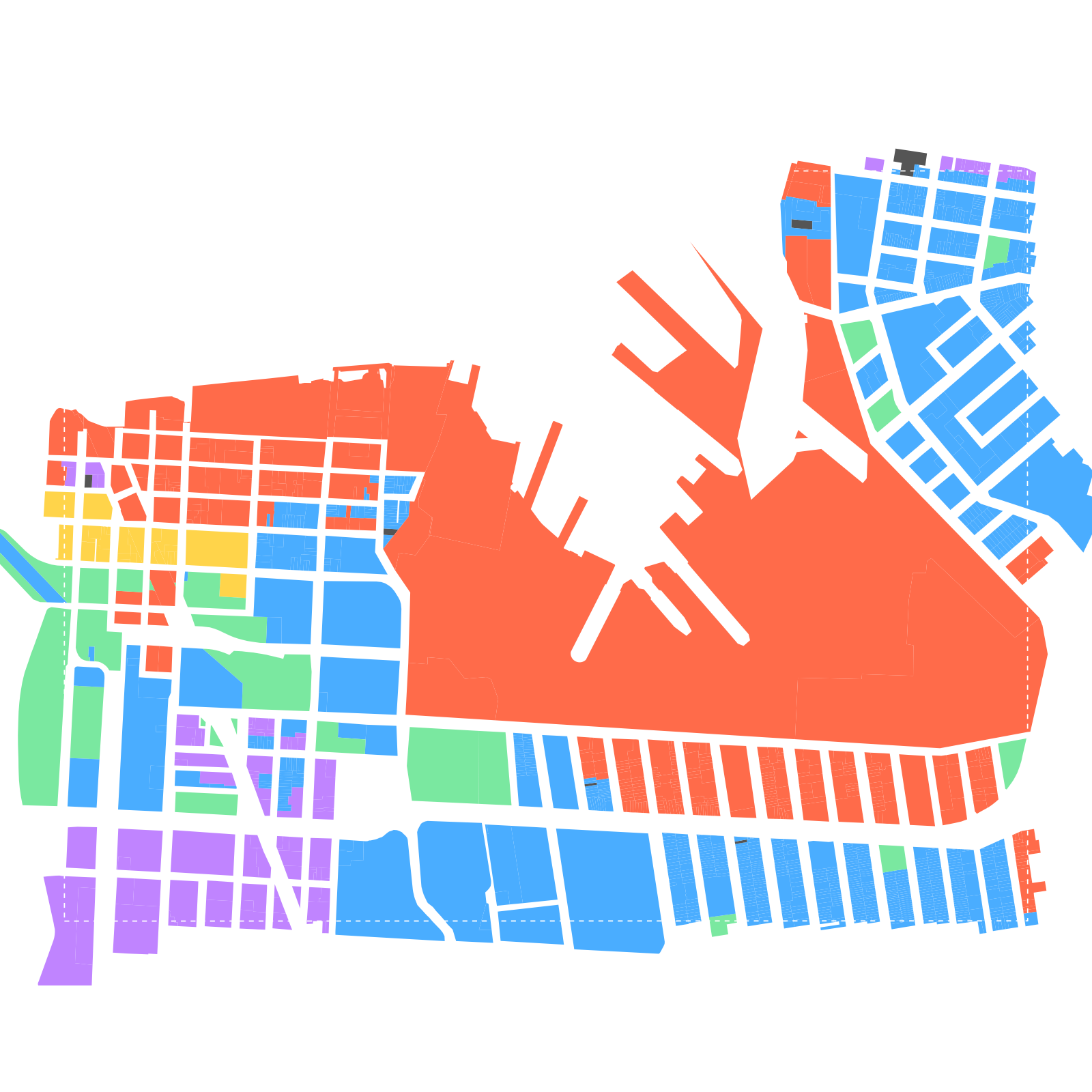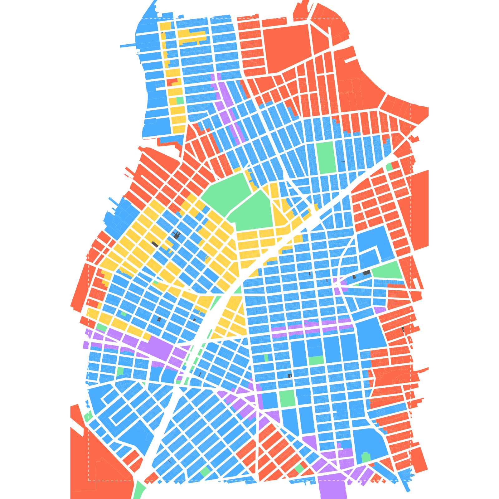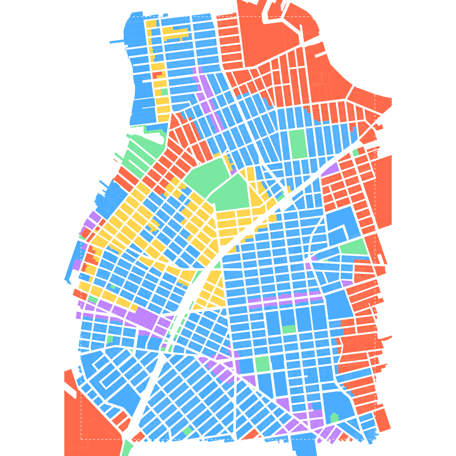 The morphological inheritance is measurable: intersection density, average block perimeter, impervious surface coverage, and tree canopy ratio all retain signatures of their manufacturing-era predecessors, even as the land use classification shifts from M to R on the zoning map.
