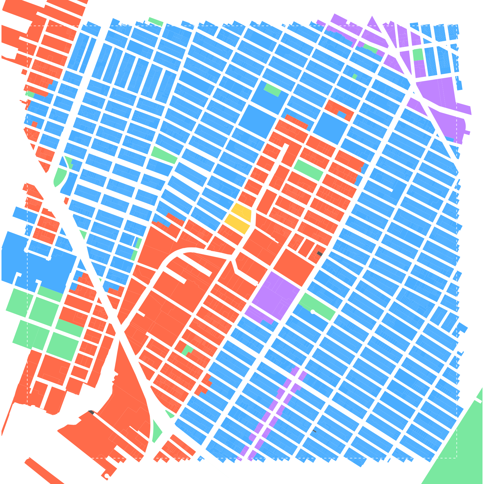 Manufacturing districts are located near arterial streets optimized for freight movement, not pedestrian circulation. When converted to residential use, these street networks — designed for truck access, loading docks, and industrial-scale block dimensions — persist as the underlying grid. The sudden introduction of residential density onto this infrastructure creates transit deserts: developments too distant from subway stations to function without personal vehicles, generating bottleneck effects that propagate through adjacent street networks.